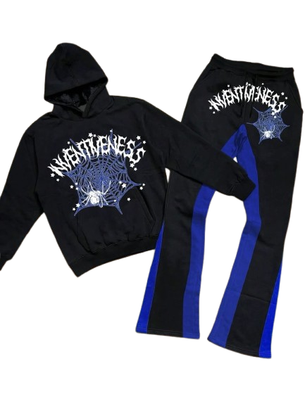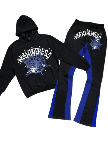 White “Broken Order” jogger tracksuit set with zip-up hoodie and matching sweatpants. Features bold black lettering, star graphics, and a comfortable streetwear design.