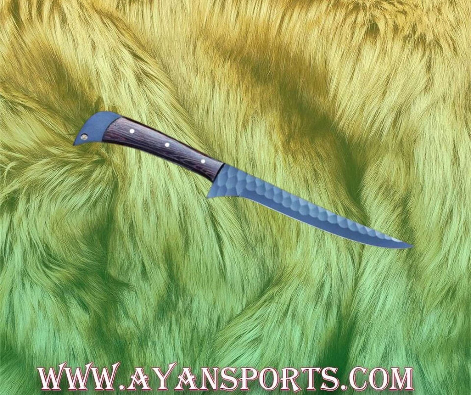 A handcrafted fixed-blade hunting knife displayed on a textured green fur background, paired with a premium brown leather sheath. The knife features a dark forged blade and an ergonomic wooden handle for durability and style.