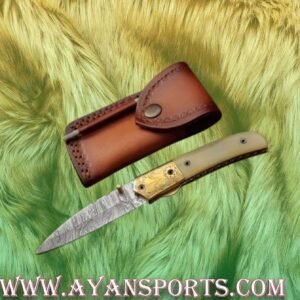 This beautifully crafted folding knife showcases a striking Damascus steel blade with distinctive wave patterns, reflecting expert craftsmanship and durability. The blade is paired with smooth, light-toned handle scales that offer a comfortable grip and a refined, classic look. A decorative brass bolster adds a touch of elegance and balance to the design.